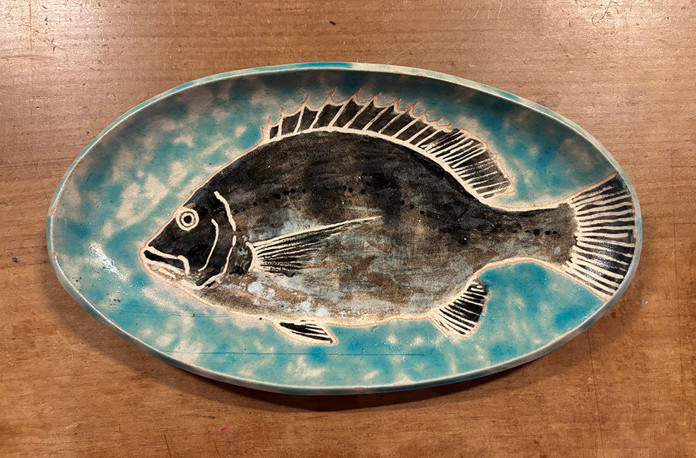 さらに、最近焼立てホヤホヤのメジナもデビューです♪鬼池港でも釣れる大きなチヌも最近 あまりの猛暑に釣りに行くこともなく、絵皿に一際精がこもっております。